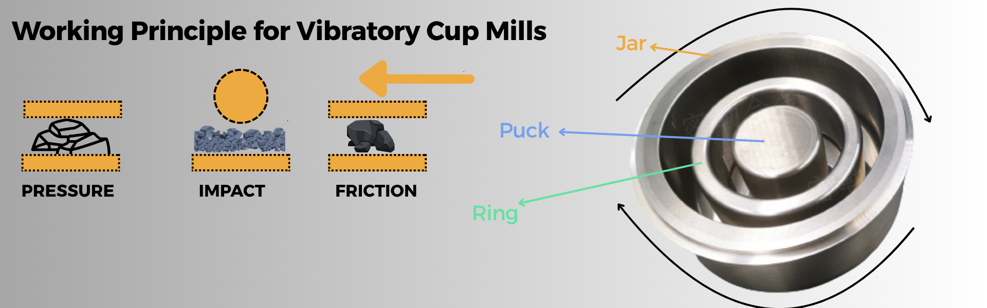 A vibratory cup mill pulverizes materials through high-frequency three-dimensional vibration.